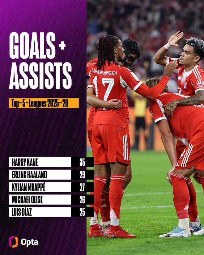 據Opta統計,拜仁慕尼黑本賽季德甲有三名球員參與至少25球,而五大聯賽其他球隊總共隻有兩名球員參與進球25+。